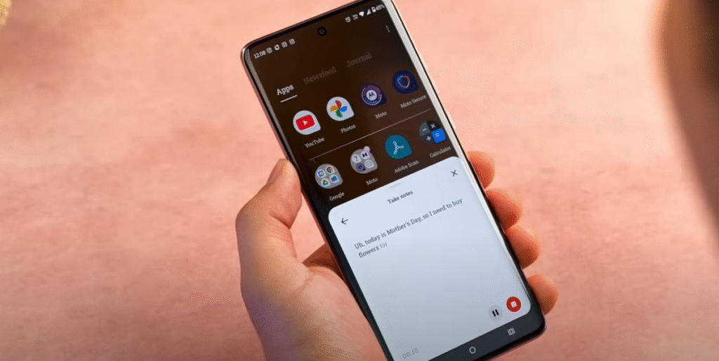AI photo enhancement, background removal, converting voice notes into text, image generation, saving any photo with text and notes, Magic Canvas, Moto Secure, and Smart Connector features are all available.